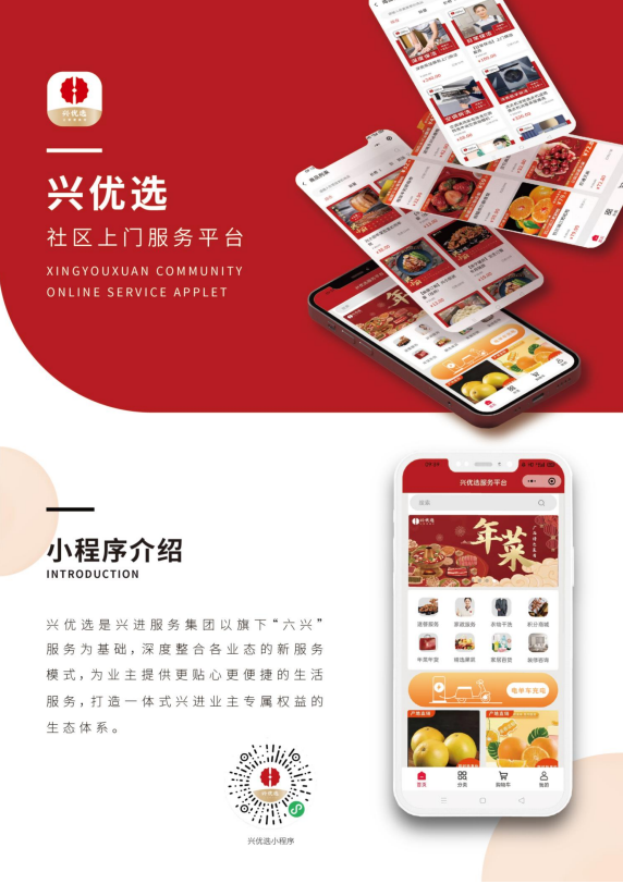 目前興進(jìn)物業(yè)圍繞客戶需求,創(chuàng)建"興優(yōu)選"線上商城,包含幸福食堂、家政保潔、房屋租售、好物購買等一站式生活服務(wù)。貼心便利的全生命周期服務(wù),只為讓您的生活溫馨舒適、便捷多彩,觸手可達(dá)。