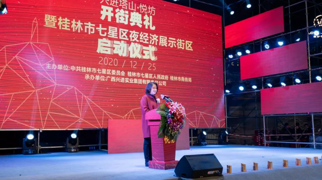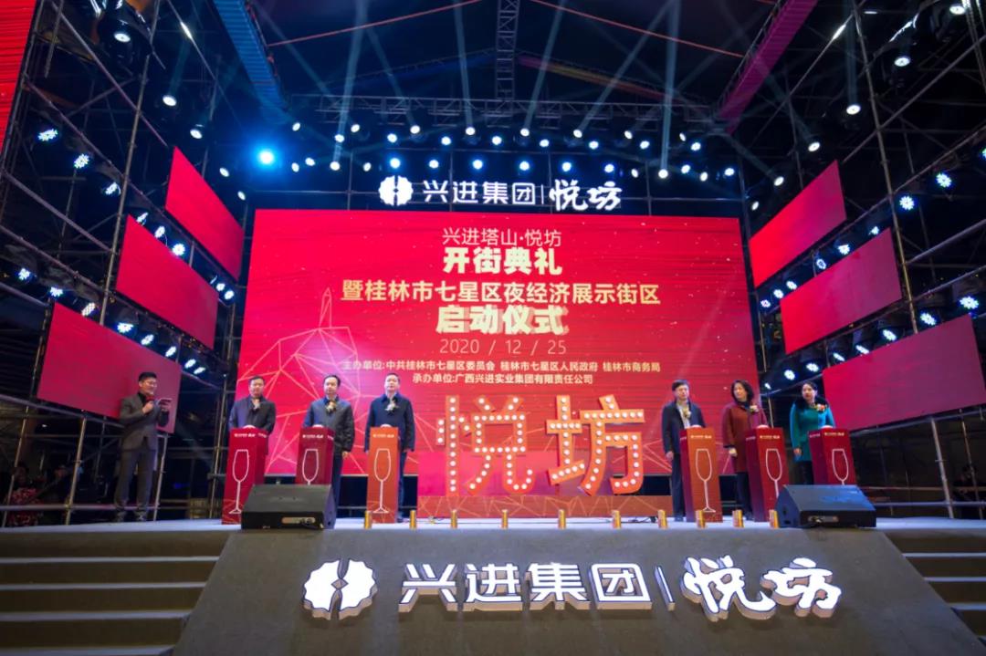 19時38分,啟動儀式正式開始。桂林市委常委、常務(wù)副市長彭代元,高新區(qū)管委會主任、七星區(qū)委書記石玉琳,七星區(qū)人民政府區(qū)長鄭平,桂林市商務(wù)局副局長呂佳軍,興進(jìn)集團(tuán)董事長羅欣,興進(jìn)集團(tuán)副總裁羅捷依次上臺。
