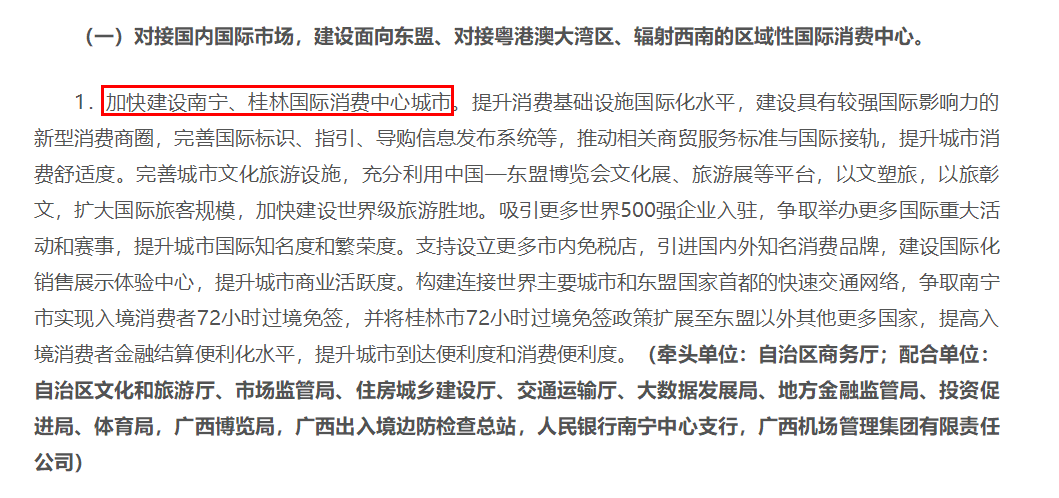 近日,自治區(qū)政府辦公廳印發(fā)《廣西打造國內(nèi)國際雙循環(huán)重要節(jié)點樞紐行動方案》中提出工作任務(wù):加快建設(shè)南寧、桂林國際消費中心城市,建立完善廣西直供粵港澳大灣區(qū)、長江經(jīng)濟(jì)帶的供應(yīng)鏈。