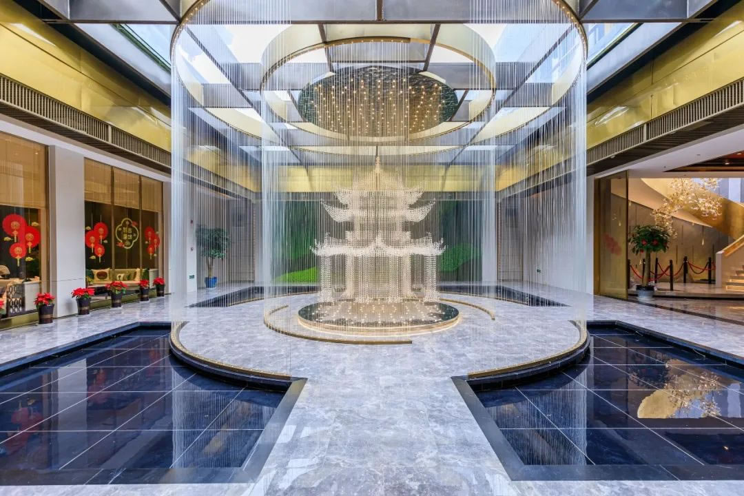 江山樾主打新中式風(fēng)格,以金色為主基調(diào),采用了王府的規(guī)制,將廡殿頂作為屋頂結(jié)構(gòu),并大量使用云紋、回形紋、山形紋等中式符號(hào)。
