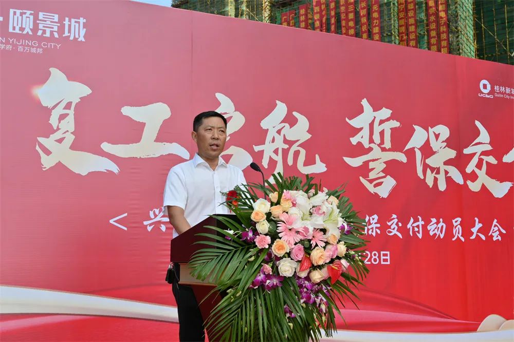 此次保交付動(dòng)員大會(huì),桂林新城投資開發(fā)集團(tuán)有限公司副總經(jīng)理鄭善華等領(lǐng)導(dǎo)代表,興進(jìn)集團(tuán)事業(yè)三部副總經(jīng)理秦達(dá)雄、客服總監(jiān)沈繼祥、興進(jìn)·頤景城項(xiàng)目總經(jīng)理?xiàng)蠲鞯阮I(lǐng)導(dǎo)代表,項(xiàng)目施工方中聯(lián)世紀(jì)代表,業(yè)主代表,渠道代表,以及媒體代表等受邀出席,共同現(xiàn)場(chǎng)見證興進(jìn)·頤景城項(xiàng)目的全面復(fù)工。